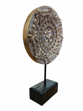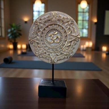 Deze strakke, ronde decoratieplaat toont het krachtige Ohm-symbool, een universeel teken van de kosmische energie en de klank van het universum. Staande op een stabiele voet, brengt dit symbool rust, harmonie en spirituele verbinding in elke ruimte. Perfect voor thuis of op kantoor, waar het een sfeer van balans en positieve energie creëert die inspireert en kalmeert.