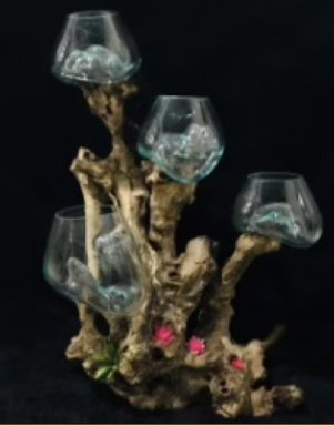 Deze decoratieve creatie bestaat uit een robuuste houten basis met daarop vier handgeblazen glazen bollen van 15 cm diameter. Elke bol heeft een ruime opening en kan multifunctioneel worden gebruikt: perfect voor theelichtjes, kleine planten, geurkaarsjes, zand- of schelpendecoratie en andere sfeervolle invullingen. De combinatie van helder glas en natuurlijk hout geeft dit stuk een warme, elegante uitstraling die moeiteloos past in moderne, landelijke en rustieke interieurs. Een veelzijdige blikvanger voor woonruimtes, horeca, wellnesscentra en stijlvolle retailomgevingen.