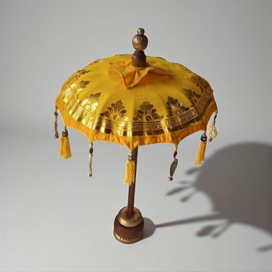 Deze elegante parasol van 70 cm hoog en 40 cm diameter komt compleet met een stevige houten voet en vormt een stijlvol decoratief accent voor binnen- en buitenruimtes. Het natuurlijke hout en het verfijnde ontwerp zorgen voor een warme, uitnodigende uitstraling, ideaal voor woonkamers, terrassen, horecaomgevingen of winkels. Licht, compact en toch opvallend, deze parasol voegt een vleugje exotische charme en gezelligheid toe aan elke ruimte.