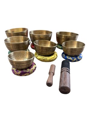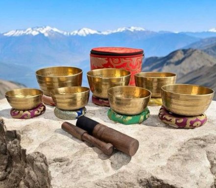 Deze volledige set van 7 Tibetaanse klankschalen creëert een rijk en harmonieus klankspectrum voor meditatie en ontspanning.