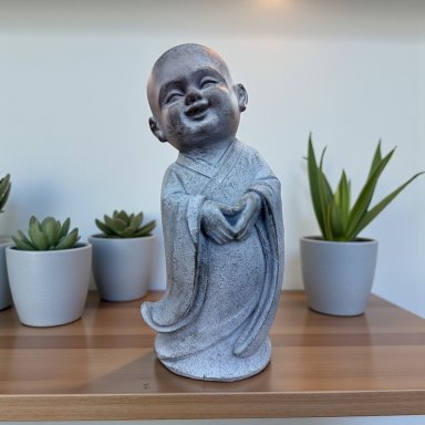 Deze staande lachende monnik met de handen nederig gevouwen naar beneden straalt vreugde, eenvoud en innerlijke vrede uit. Een symbool van dankbaarheid en lichtheid in het leven – perfect als sfeervolle decoratie die positiviteit en rust brengt in elke ruimte.