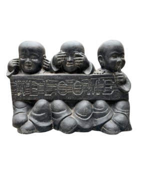 Deze charmante set van drie monniken met een bord waarop "Welkom" staat, brengt direct een gevoel van rust en hartelijkheid in huis.