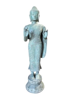 Deze staande Boeddha in bronzen legering, met afmetingen van 90 × 23 × 23 cm, combineert een statige aanwezigheid met een verfijnde afwerking. De zachte glans van het metaal en de zorgvuldig uitgewerkte details geven het beeld een tijdloze en serene uitstraling. Een elegant decoratief stuk dat spiritualiteit, stijl en vakmanschap moeiteloos samenbrengt.